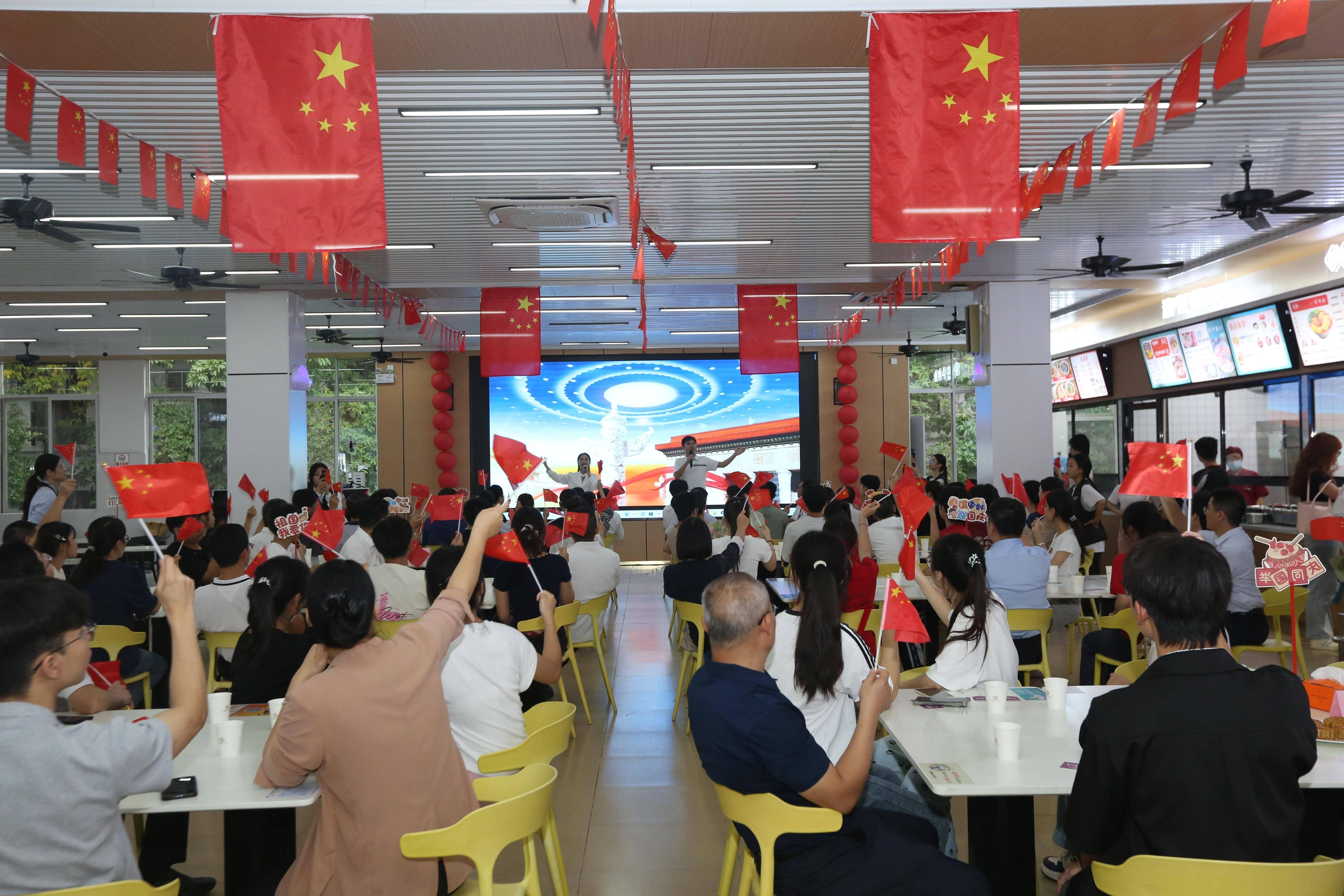 “今日中国巍然屹立傲视四方,民族复兴的使命正由我们担当……”活动现场,学生代表深情朗诵经典篇目《这盛世如您所愿》,抒发了对中国日益强盛的由衷赞叹。教师代表共同唱响《今天是你的生日》,传递出对祖国的深切祝福。现场气氛热烈,全体校领导与师生代表一同挥舞国旗,齐声高歌《歌唱祖国》等歌曲,以激昂的歌声共同表达对祖国繁荣富强的美好祝愿?;疃詈螅迨ι黄鸸步聿?,大家共叙教学日常,现场氛围其乐融融。