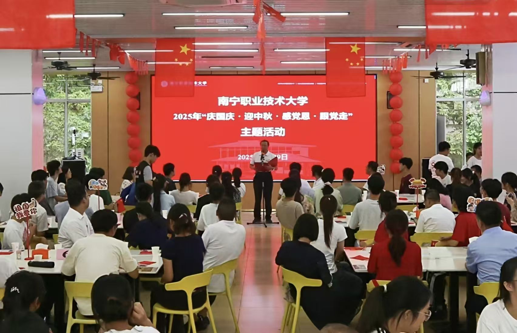 为庆祝新中国成立76周年,喜迎中秋佳节的到来,9月29日,南宁职业技术大学2025年“庆国庆·迎中秋·感党恩·跟党走”主题活动在第二食堂举行。学校党委书记蹇兴超出席活动并讲话?;疃裳5澄笔榧?、校长周旺主持。学校党委副书记杨清源,学校党委常委、副校长万玉文、黄春波、李东升、胡卫东出席活动。