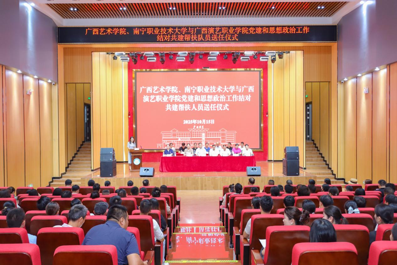 为贯彻落实自治区党委教育工委关于公办高校与民办高校党建及思想政治工作结对共建的工作部署,充分发挥公办高校在党建和思想政治工作中的示范引领作用,推动民办高校党建与思想政治工作质量提升,10月15日上午,南宁职业技术大学、广西艺术学院与广西演艺职业学院党建和思想政治工作结对共建帮扶队员送任仪式和帮扶工作研讨会在广西演艺职业学院举行。学校党委书记蹇兴超,广西艺术学院党委副书记毛茂林及广西演艺职业学院党委书记潘登斌参加本次活动。