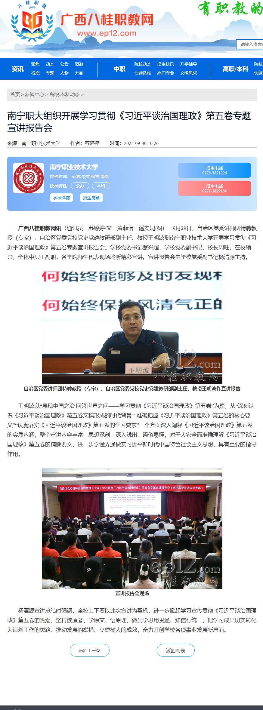 电话:0771-2029337(党政办公室) 0771-3821226(招生就业处)