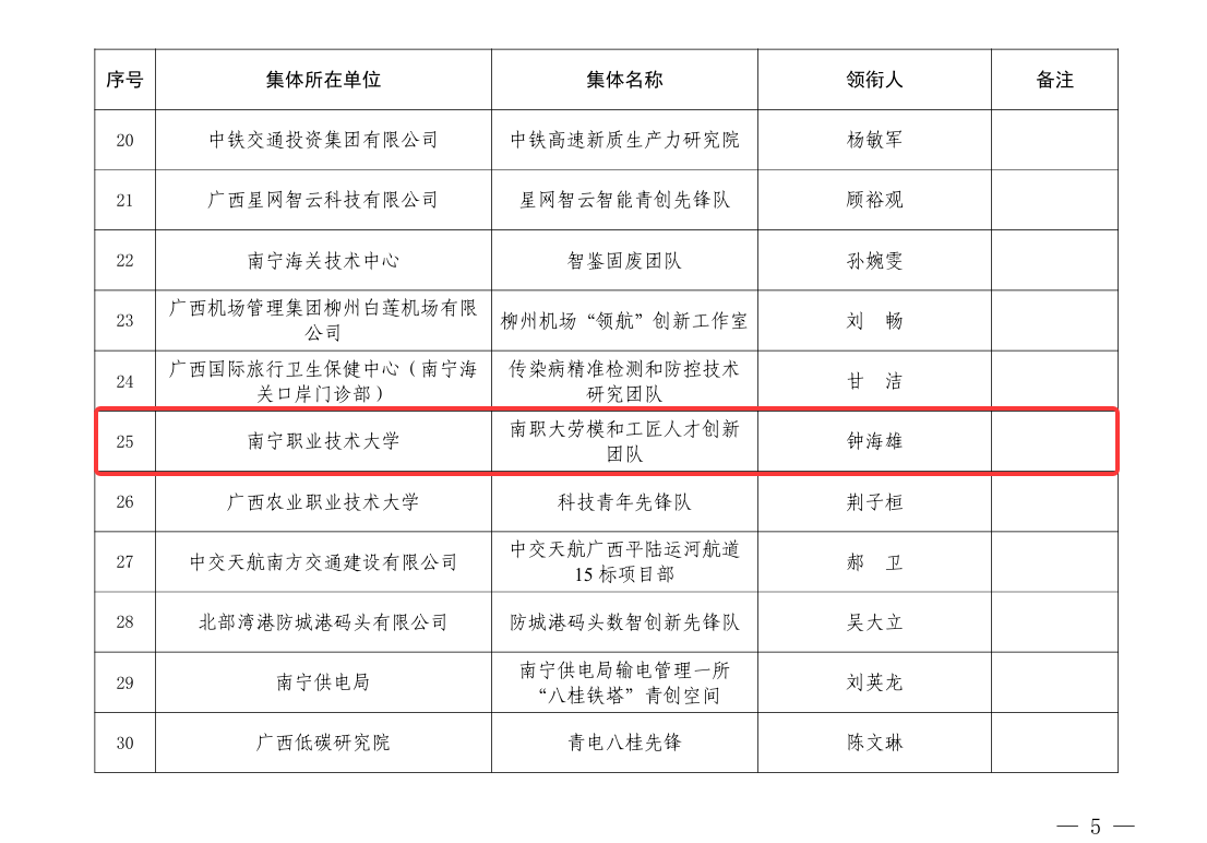 近日,共青团广西区委公布了第四批“广西青创空间”集体名单。由我校智能工程学院钟海雄老师领衔的“劳模和工匠人才创新团队”在评选中脱颖而出,获评第四批“广西青创空间”建设集体。