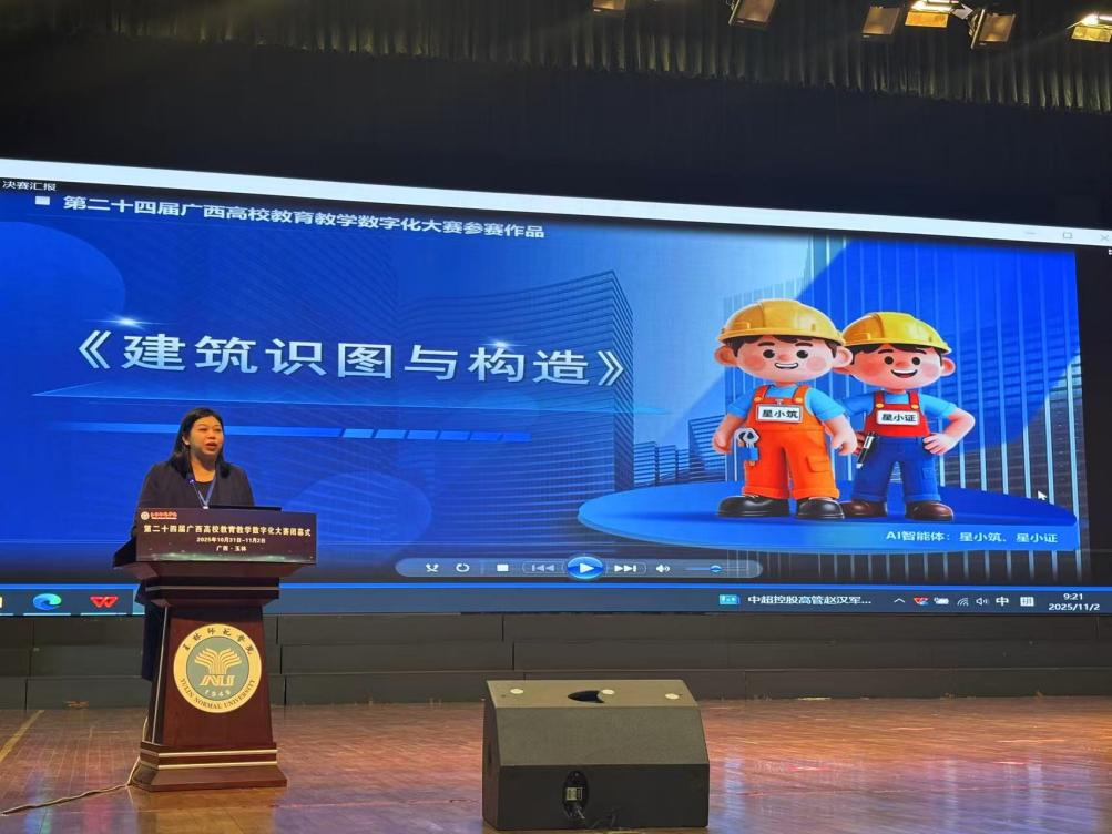 11月2日,第二十四届广西高校教育教学数字化大赛决赛在玉林举行,我校智慧城市学院教师王宇平、杨佳佳、黄晓明、李群及教务处教师蒋丽娟组成的参赛团队,凭借参赛作品“AI融合数字化课程建筑识图与构造”在高职理工课程组18支决赛队伍中脱颖而出,以排名第一的优异成绩荣获一等奖。