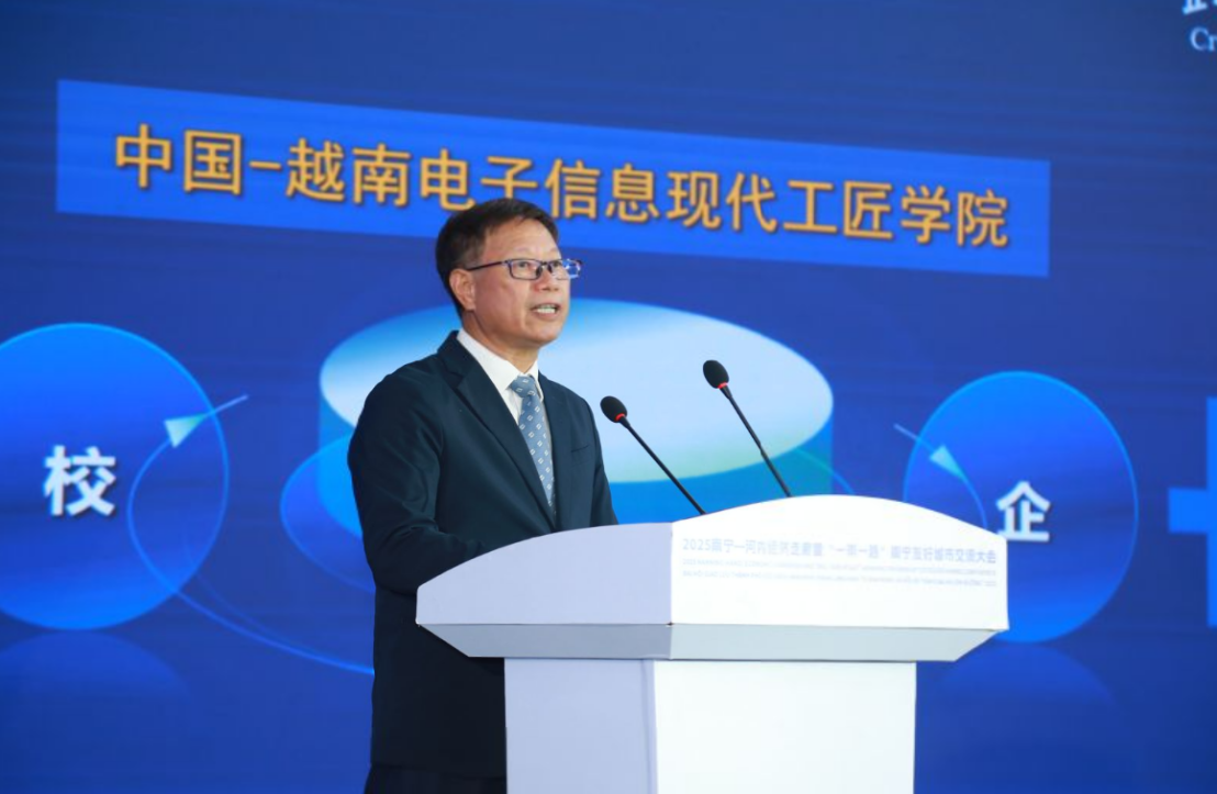 近日,2025南宁—河内经济走廊暨“一带一路”南宁友好城市交流大会在南宁举行?;嵘?,我校分别与越南河内学院、立讯集团签订合作协议。学校党委副书记、校长周旺出席大会,并分享了与东盟国家合作办学经验。